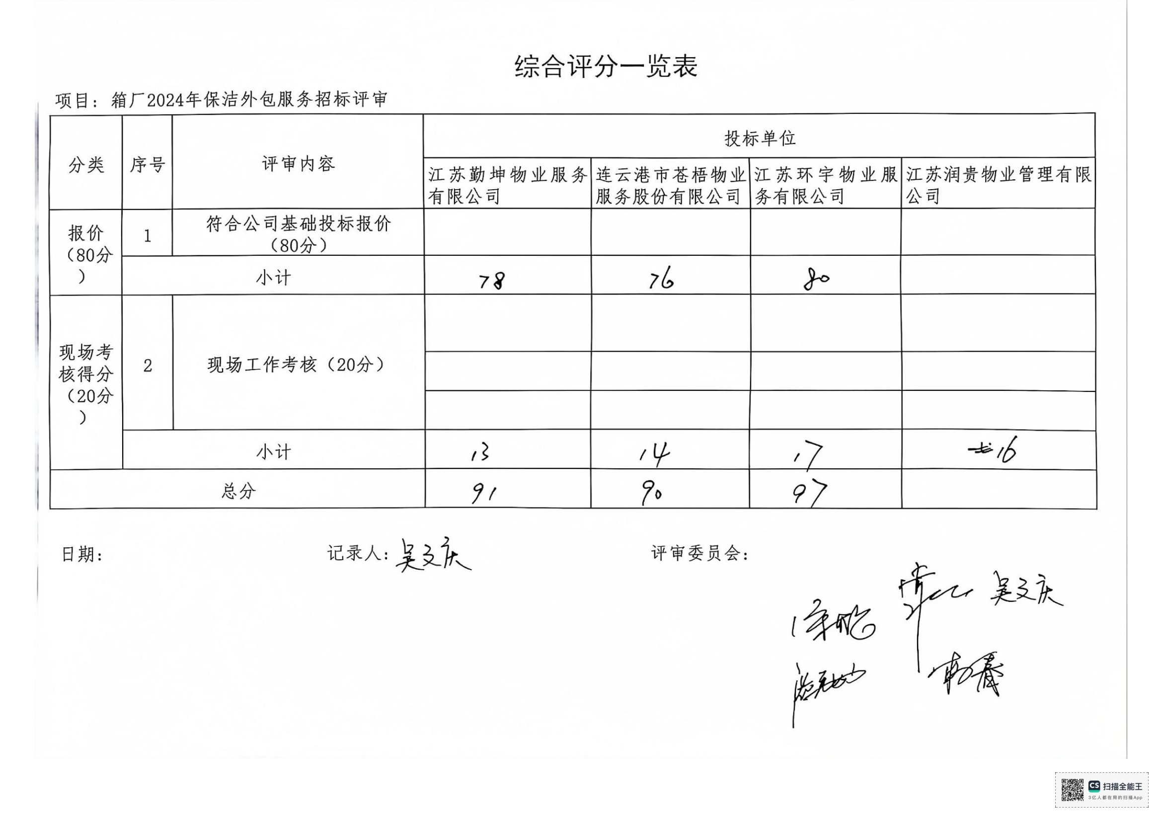 我司2024年《保洁外包服务》询比价项目,评审工作已结束,现已确定中标单位